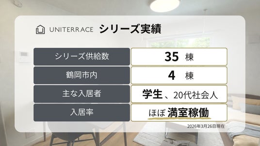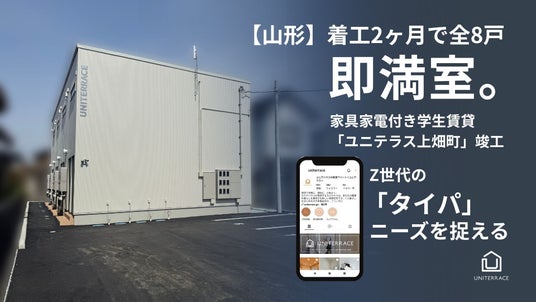 「ユニテラス上畑町」は、山形大学農学部エリアに位置する家具家電付き1Rの重層長屋アパートです。2025年10月の募集開始直後から問い合わせが相次ぎ、12月には全8戸が成約に至りました。