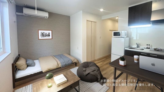 1Fの内観画像。冷蔵庫、電子レンジ、テレビの家電付き。ベッド、ローテーブル、テレビボード、キッチンカウンターテーブル等家具も備え付けており、入居後すぐに新生活を始められる仕様が学生に人気。(※家具小物はイメージです)