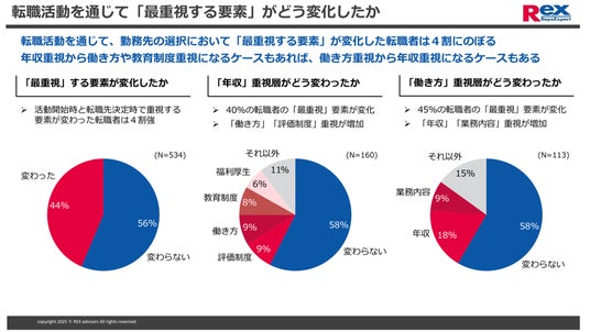 - 転職活動の開始時と転職先の決定時で、最重視する要素が変化した転職者は、全体の44%にのぼる