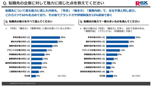 - 年収以外では、働き方が魅力的(転職者の36%)、業務内容が魅力的(同29%)に加え、ブランドが魅力的(同21%)が上位に来る