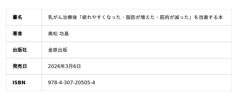 乳がん治療後の体の変化を、運動と食事の両面から支える実践書本書は、乳がん治療後に多くの方が感じる「疲れやすくなった」「脂肪が増えた」「筋肉が減った」といった悩みに対し、スポーツ医学の知見と現場での実践をもとに、運動と食事の工夫をわかりやすく解説した一冊です。治療後の体づくりに悩むご本人はもちろん、ご家族や医療従事者にも役立つ内容です。