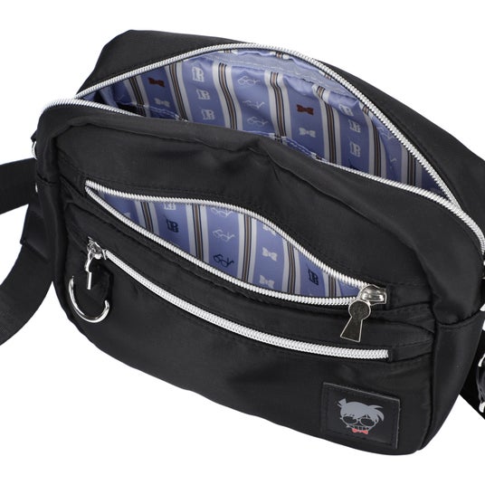 江戸川コナンのモチーフデザインの織りネームがポイントのショルダーバッグです。内生地には蝶ネクタイ型変声機や少年探偵団バッジなどのモチーフをあしらい、シンプルな見た目ながら作品の要素を感じられる一品に仕上げました。ファスナー付きの外ポケットなど収納力も抜群で、日常にさりげなく『名探偵コナン』を取り入れられます。