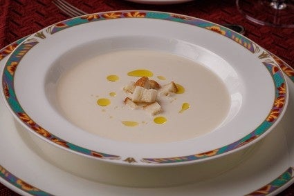 素材の甘みを活かした冷製スープ。カリフラワーを丁寧に火入れし、なめらかに裏ごしして仕上げました。クリームのまろやかなコクが重なり、優しい味わいが広がります。一口ごとに感じるやさしい香りが、コースの流れを整える役割を担います。