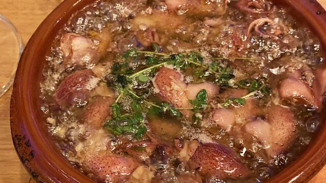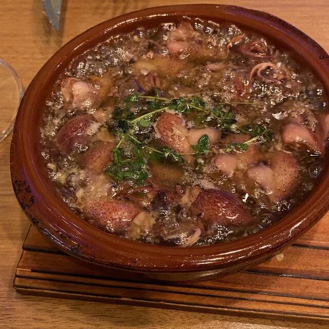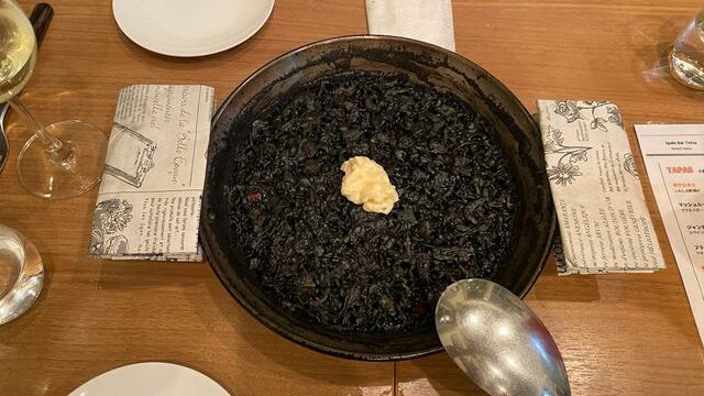 イカ墨のパエリア、白ワイン(ヒメネス)。