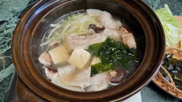 三日前にいただいた生わかめ、今日こそしゃぶしゃぶにしていただきます。昆布と鰹節で出汁をとって漉し、椎茸と豚バラ肉で追い出汁(こんな言い方あるか?)。