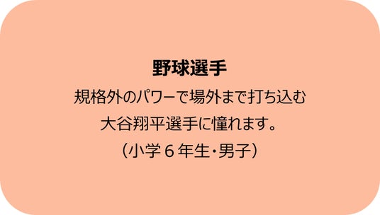 一方で、具体的な人物名のなかで最も多かったのが大谷翔平選手です。男女・学年を問わず名前が挙がり、「努力」「多才さ」「世界で活躍する姿」といった点が、憧れの理由として挙げられました。スポーツ選手に憧れる子どもだけではなく、広く“挑戦する生き方の象徴”として認識されているといえるでしょう。