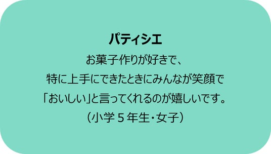 小学生女子では、「パティシエ」が6連覇を達成し、「幼稚園の先生/保育士」が昨年の10位圏外から一転、第3位にランクイン。なりたい理由には、自身の体験に根ざした動機が目立ちました。「パティシエ」は、「家族や友達に食べてもらい、喜ぶ顔を見るのが嬉しい」など、「ものづくりの楽しさ」や「人を喜ばせる達成感」が志望理由の中心となっています。「幼稚園の先生/保育士」は、自分が幼稚園・保育園でお世話になった先生への憧れや実体験を理由に挙げている子が多く、どちらの職業も、「好き」「楽しい」「かわいい」といった感情が、将来像へと自然につながっている点が特徴です。