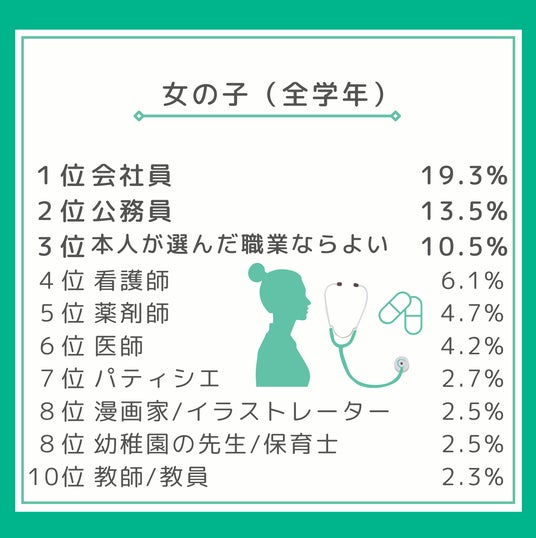 就職活動においては「オヤカク」(内定を出した学生の「親」に対して、企業が「確」認をおこなうこと)をする企業が増えており、その背景として親子の距離感が近く、気軽に相談できる関係になってきているといわれています。そのためか、全体的にランクインしている職業は、男女ともに子どもたちのランキング上位と共通する傾向となりました。
