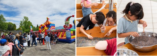 レジャーシートを敷いて桜を間近で観ながら、おいしいワインや山梨県産のぶどうやもものジュース、温かいうどんや味噌田楽、甘酒に舌鼓、子どもたちに大人気のふわふわ遊具やおとなも夢中になる「フルーツ温泉ぷくぷくの宝石探し」も楽しめます。