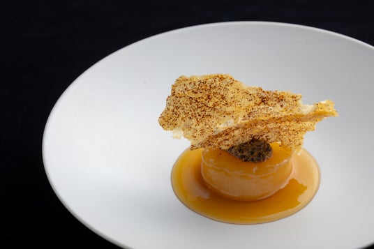 【Chaud】大和の慈愛 ~蕪 湯葉 コンソメ トリュフ~兄を支え、農政に力を注いだ弟・秀長へのオマージュ。大和国統治時代に縁のあった「湯葉」を使用し、現代的なコンソメとトリュフの香りで包み込みました。仕上げに八丁味噌のパウダーをまぶした湯葉チップを添え、秀長の誠実で温かな人柄を表現しています。