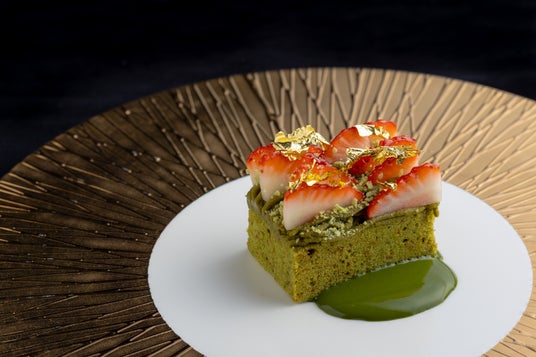 【Dessert】黄金の茶室 ~抹茶 苺 金箔~秀吉が愛した「金の茶室」をイメージ。濃厚な抹茶のパウンドケーキとクリームに金箔をあしらい、絢爛豪華な文化を表現しました。仕上げにお客様の目の前で抹茶ソースをかけて完成させる、体験型のデザートです。