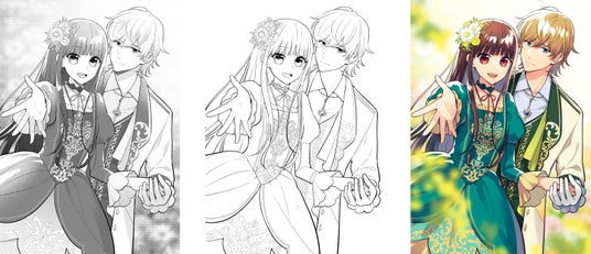 画像処理の比較 左:製版データ(スクリーントーンあり)、中:eComicScreen ReMでのトーン除去後※2、右:カラーリング後 ※2 eComicScreen ReMは、トーン除去までを担当します
