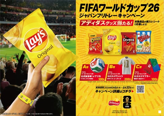 世界100ヵ国以上で販売されているポテトチップスブランド「レイズ」を日本で販売するジャパンフリトレー株式会社(カルビーグループ、本社:茨城県古河市、代表取締役会長兼社長:石辺 秀規)は、2026年6月より開催される「FIFAワールドカップ2026」の公式スナックである「レイズ」「ラッフルズ」「ドリトス」「チートス」「マイクポップコーン」の日本限定キャンペーンの第二弾として400名様にアディダスグッズが当たる『FIFAワールドカップ26ジャパンフリトレーキャンペーン』を2026年4月6日(月)より開催します。