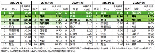 また、2025年版までは5位~7位だった大塚駅が今回は2位におどり出ていますが、家賃相場が以前よりも下がったわけではなく、ほかの駅の値上がり幅が大きいため相対的に順位がランクアップした様子です。ここ5年間の家賃相場を見ると、8万円台の駅があったのは2024年版まで。そして2025年版では9駅あった家賃相場9万円台の駅が今回は2駅のみに。都内の家賃相場の高まりも分かるランキングになりました。