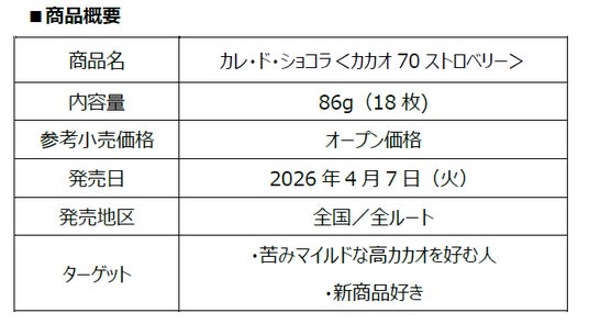 今回の新商品では、カカオ70%の高カカオチョコレートに苺を合わせ、特有の苦味をまろやかにして、食べやすいおいしさに仕上げました。苺の甘酸っぱさもしっかり感じられる味わいで、忙しい新生活の合間にも、手軽に上品な甘さに包まれる贅沢なひとときをお楽しみいただけます。華やかに香る苺とカカオを愉しめる「カレ・ド・ショコラ<カカオ70 ストロベリー>」の発売を通じて、チョコレート市場の活性化に貢献し、お客様に笑顔をお届けしてまいります。