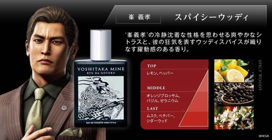 「桐生一馬」は、清々しく力強い生き様をロータスなどのアクアティックノートで、その奥にある優しさをムスクで表現。対して「峯義孝」は、冷静沈着な性格を爽やかなシトラスで、その裏に潜む狂気をスパイシーなウッディで表現した、躍動感のある香りで表現しています。「龍が如く」シリーズの重厚な世界観と、二人の熱き魂がどのようなフレグランスとして昇華されたのか、ぜひご体感ください。