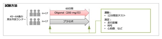 本試験は無作為化二重盲検プラセボ対照並行群間試験※3で、長距離ランナー34名(45~64歳の成人男女)を対象に、200mg/日のオリゴノール(R)またはプラセボを60日間摂取してもらいました。0日目と60日目に12分間走試験を実施し、主要評価項目として走行距離を評価しました。副次評価項目としては心拍数、RPEスコア、体組成を含めました。その結果、12分間走試験において主要評価項目である走行距離はオリゴノール(R)群がプラセボ群と比較して有意に増加しました(平均70m)。また、副次評価項目であるRPEスコアについてはオリゴノール(R)群がプラセボ群と比較して有意な軽減を示しました。その他の副次評価項目において差は認められませんでした。このことからオリゴノール(R)が男女の持久力パフォーマンス向上に貢献する可能性が示唆されました。