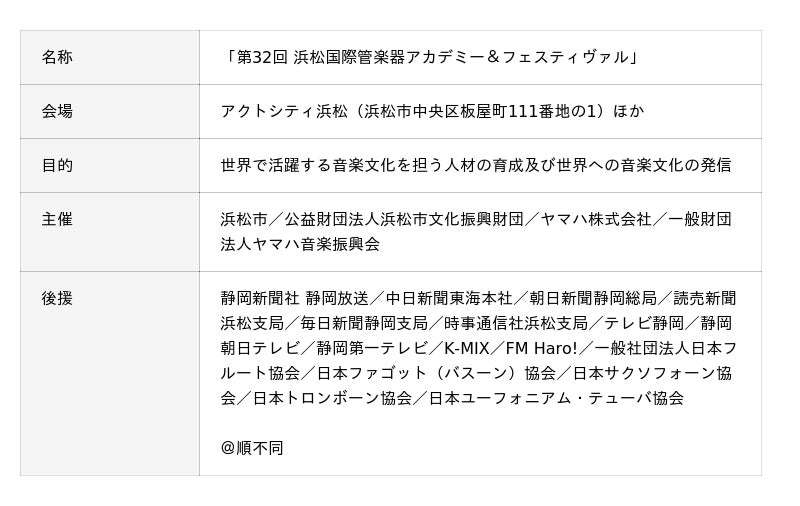 浜松市は浜松市文化振興財団、ヤマハ株式会社、ヤマハ音楽振興会との共催により、「第32回 浜松国際管楽器アカデミー&フェスティヴァル」を8月3日(月)~8月8日(土)の6日間、アクトシティ浜松などを会場に開催いたします。