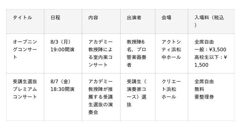 開催場所は、利便性の高さで知られるJR浜松駅に隣接する音楽ホールを含む複合施設・アクトシティ浜松などを拠点としたエリアです。現在国内外で活躍するプロの管楽器奏者らが学生時代に数多く参加しているのも特徴のひとつで、初回からの受講者数は延べ3,500人を超えています。