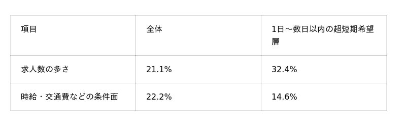 超短期就業を希望する層では、待遇面の比較よりも、まず就業機会そのものを確保できるかどうかが重視されている可能性が示されました。
