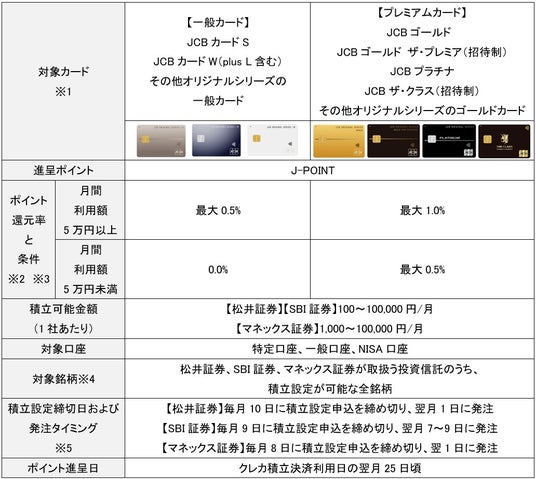 JCBが発行する個人向け「JCB オリジナルシリーズ」の各券種を利用でき、クレカ積立金額に応じた「J-POINT」が進呈されます。また、JCBのクレカ積立がマネックス証券に対応したことにより、お客様は積立する証券会社を、従来の松井証券株式会社(以下「松井証券」)、株式会社SBI証券(以下「SBI証券」)を含めた3社より選択いただけるようになります。