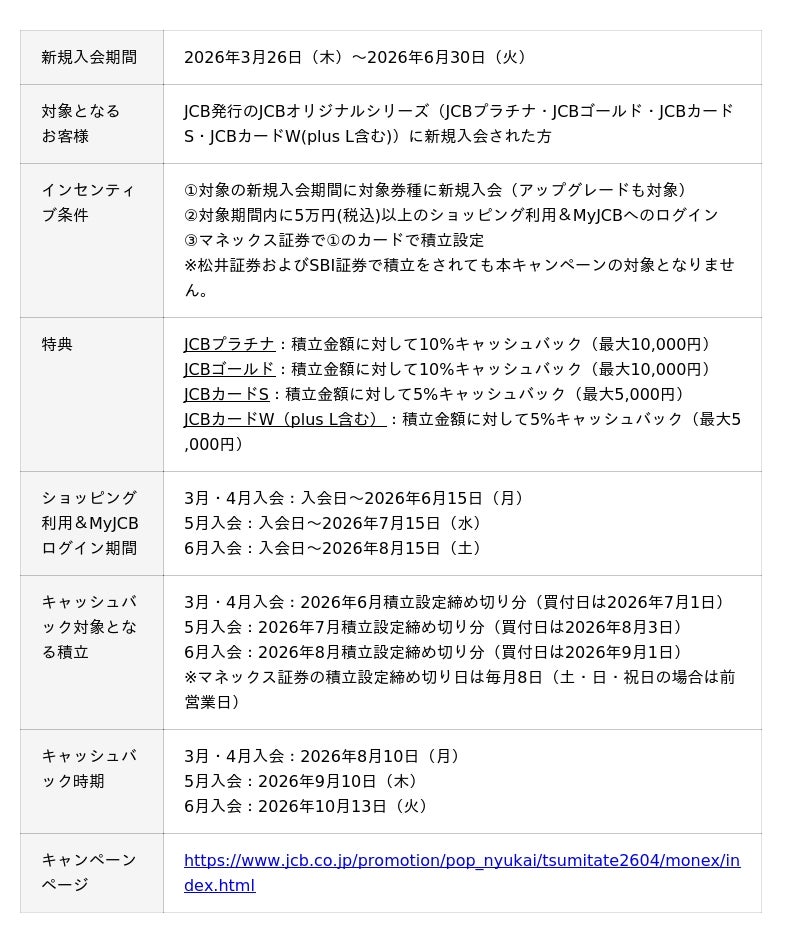 株式会社ジェーシービー (本社:東京都港区、代表取締役会長 兼 執行役員社長:二重 孝好、以下「JCB」)は、2026年3月26日(木)よりマネックス証券株式会社(本社:東京都港区、取締役社長執行役員:清明祐子、以下「マネックス証券」)との間で、クレジットカードで投資信託の買い付けが行える、「JCBのクレカ積立」の提供を開始いたします。また、新サービスの提供開始にあわせて、「JCBのクレカ積立利用で最大10%キャッシュバックキャンペーン」を実施します。