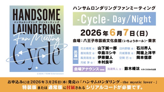 また、発売を記念した初のリアルイベント『ハンサムロンダリング ファンミーティング -Cycle-』の2026年6月7日(日)開催が決定し、初回生産分付属のシリアルチケットによる申し込み受付を本日より開始いたしましたので、あわせてお知らせいたします。