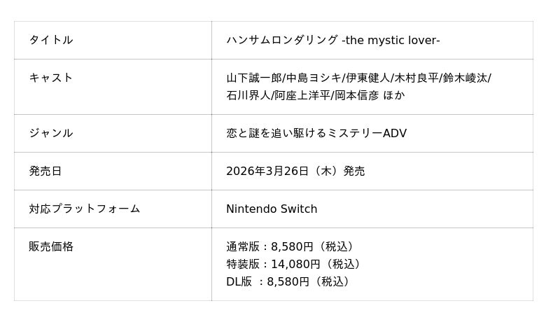 株式会社エディア(本社:東京都千代田区、代表取締役社長 :賀島 義成、以下:当社)は、子会社である株式会社ティームエンタテインメント(本社 :東京都千代田区、代表取締役社長 :賀島 義成、以下:ティームエンタテインメント)の女性向けCDレーベル「MintLip(ミントリップ)」より展開中のオリジナルドラマシリーズ『ハンサムロンダリング』から、コンシューマ向けブランド「MintLip+(Plus)」の新作乙女ゲームNintendo Switch『ハンサムロンダリング -the mystic lover-』を本日2026年3月26日(木)に発売いたしましたことをお知らせいたします。