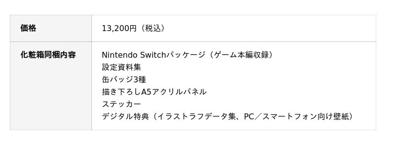 ゲーム本編の収録されたNintendoSwitchパッケージに加え、設定資料集や描き下ろしA5アクリルパネルなど5種類のグッズの付いた豪華な「特典ボックス」が一部店舗およびECサイトにて好評販売中です。