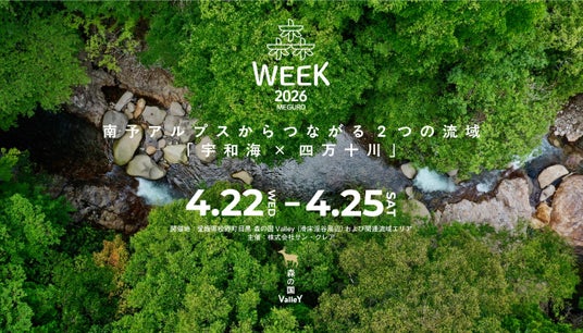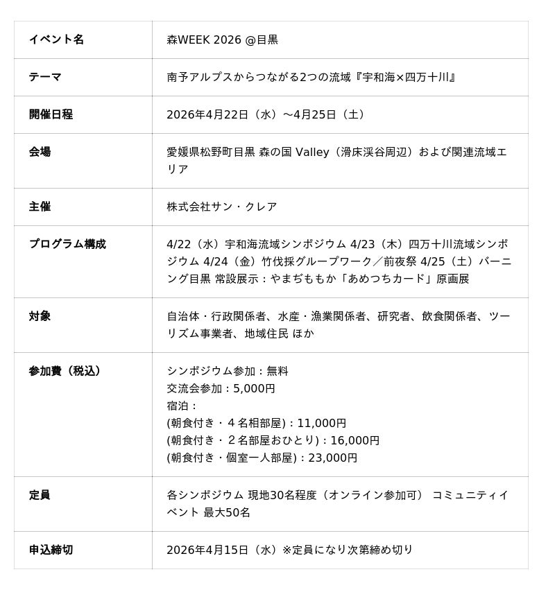 株式会社サン・クレア(本社:広島県福山市、代表取締役:細羽雅之)は、2026年4月22日(水)から25日(土)までの4日間、愛媛県松野町目黒・滑床渓谷を拠点に、総合イベント「森WEEK 2026 @目黒」を開催いたします。 本イベントは、南予アルプスを源とする「宇和海」と「四万十川」という2つの流域をテーマに据え、シンポジウム、フィールドワーク、コミュニティイベント、展示を通じて、自然と人の共生のあり方を実践的に探究する試みです。 多様な主体が一堂に会し、知見を交わしながら「共生のこれから」を探究する創造的なプラットフォームを目指します。