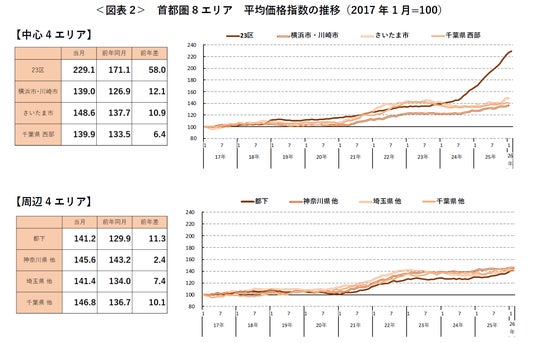 なお、東京都(23区/都下)、神奈川県(横浜市・川崎市/他)は2017年1月以降最高額を更新した。東京23区の前年同月比は33.9%と、2025年5月以来10カ月連続で30%台の高水準となった。