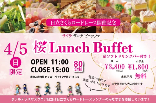 ホテルテラスザスクエア日立(所在地:茨城県日立市幸町1-20-3、副総支配人:城戸康)では、さくら祭りにあわせて開催される日立市のロードレースに合わせて幅広い年代の方にお楽しみいただける和洋中多彩なバイキングを企画いたしました。通常のバイキングにスイーツが盛りだくさんなビュッフェをご用意いたします。ホテルシェフ特製の料理に舌鼓を打ちながら、ご家族・ご友人と一緒に楽しいひと時をお楽しみください。