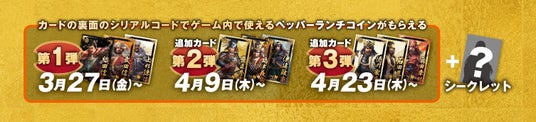 コラボ期間中は、織田信長、豊臣秀吉、徳川家康のゆかりの地にちなんだ食材を使用した3種の限定ペッパーライスをご注文いただいた方に、ゲーム内で使えるペッパーランチコインがもらえるオリジナル武将カードをプレゼントいたします。