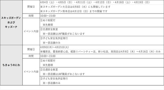 ※イベント内容2.の交通安全教室の詳細は、以下「一部店舗での取り組み」をご確認ください。※店舗ごとに開催日、開催時間、イベント内容が異なる場合や、予告なく変更となる場合があります。