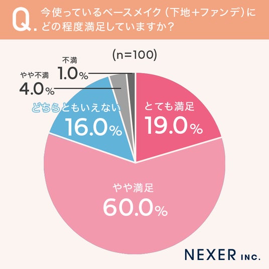 その結果「とても満足」が19.0%、「やや満足」が60.0%で、合わせて79.0%の方が現在のベースメイクに満足しているという結果になりました。一方「どちらともいえない」は16.0%、「やや不満」は4.0%、「不満」は1.0%です。