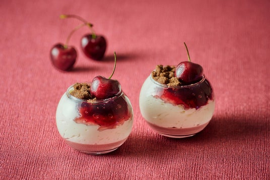 A. チェリーのムースに、シロップを染み込ませたスポンジとミルクの風味豊かなクレームダンジュを重ねたグラススイーツです。トップにはフレッシュチェリーやジュレをあしらい、甘酸っぱさとミルキーな味わいのコントラストをお楽しみいただけます。