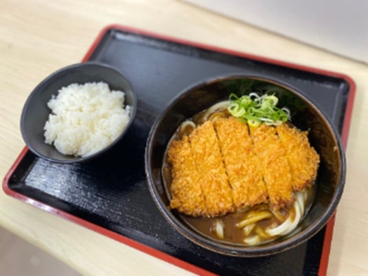 カレーうどんにカツを乗せ、ご飯も付いたボリュームたっぷりのメニューです。
