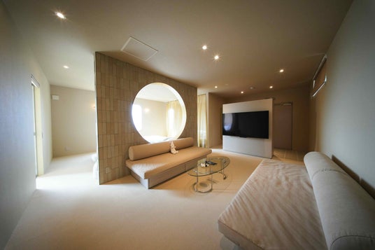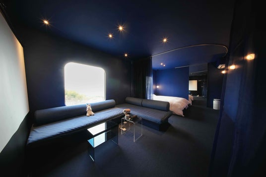 夕陽から夜のブルーへの移ろいを感じられる、夢とインスピレーションの部屋。プロジェクターを備え、映画鑑賞やスポーツ観戦、推し活など、過ごし方の幅が広がる空間設計が特徴です。