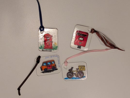 プラ板にポストは郵便配達用のバイクなど、郵便に関する絵を描いてお名前のチャームを作ります。
