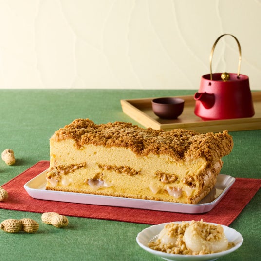 台湾の定番スイーツ「ピーナッツ餅」を台湾カステラで再現しました。とろりと伸びる高級羽二重餅に、香ばしい特製ピーナッツ餡を合わせた贅沢な一品です。