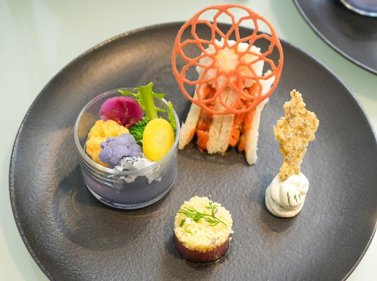 《別皿》スモークサーモンサンド ビーツ香るラングドシャ飾り/花野菜のアクアリウムサラダ/