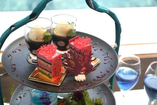 ティースタンドの上段には、アトア3F『FOYER-探求の室』で出会える「ポルカドットスティングレイ」をモチーフにしたコーヒーゼリー、同フロア『MIYABI-和と灯の間』の風光明媚な和の世界からインスピレーションを得たさくらんぼのケーキが並びます。