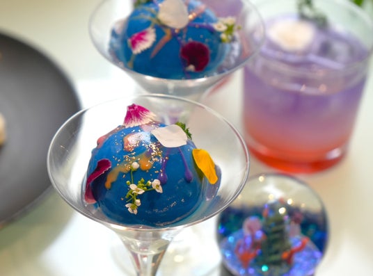 アトアのシンボリックな存在でもある、日本最大級の球体水槽「AQUA TERRA」。ミストとレーザーが織りなす光のベールで包まれた姿を、鮮やかなブルーのグラサージュが目を引くムースケーキで表現しました。ザクザクとした食感のクリスティアンをアクセントに、ブラッドオレンジのムースの下に、バタフライピーと柑橘のジュレを重ねた層に仕立てました。