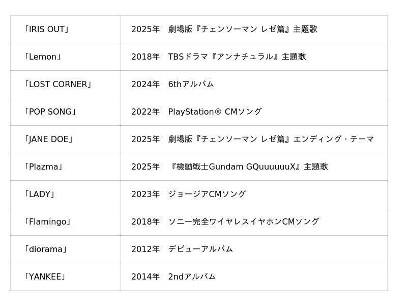 劇場版『チェンソーマン レゼ篇』主題歌として大きな話題となっている「IRIS OUT」をはじめ、宇多田ヒカルさんとコラボした「JANE DOE」、大ヒット曲「Lemon」、最新アルバム「LOST CORNER」など数々の名盤がキーホルダーになりました。