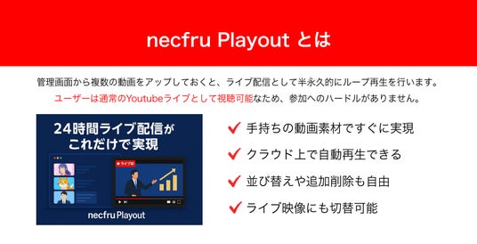 「necfru Playout」は、動画素材をアップロードするだけで、YouTube Live上での24時間ライブ配信を実現できるクラウドサービスです。