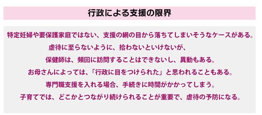 例えば、▼話し相手になってくれることが親のメンタルの安定につながる、▼一緒に育児することが子どもの発達発育を促すきっかけになる、▼利用が無料なので勧めやすい、などの点です。