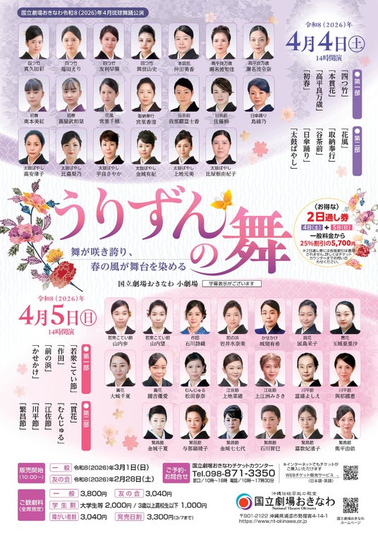 琉球舞踊公演 うりずんの舞草花がみずみずしく芽吹く「潤初(うりずん)」の季節にちなみ、各流会派の師匠のもとで日々研鑽を積む中堅・若手の女性舞踊家による古典舞踊、雑踊、創作舞踊をお届けいたします。地謡も若手の女性・男性演奏家が担当し、新年度の幕開けにふさわしい爽やかな公演を上演いたします。