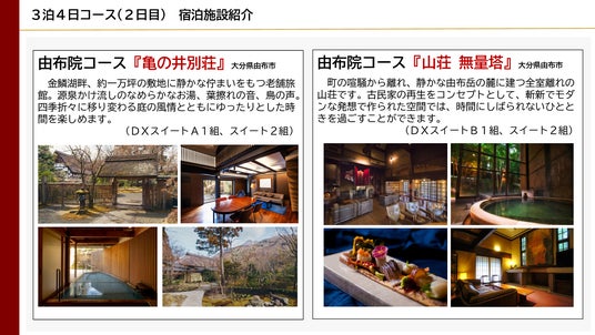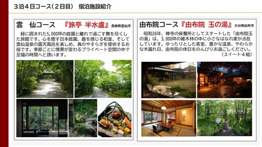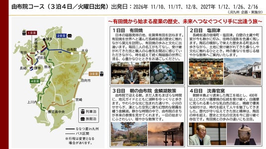 ・3月よりコースバリエーションが増え、より季節感溢れる九州を味わえる旅へ。・3泊4日「由布院コース」では、2日目に“ゆふいん御三家”にご宿泊。立ち寄り先では、 有田焼の名匠との交流から“つくり手”のおもいに触れます。