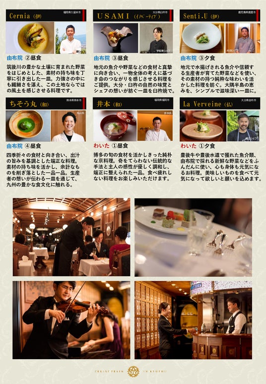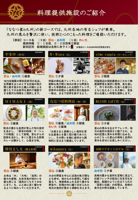 山と海に囲まれ、自然の恵みに包まれた九州は食材の宝庫。その土地に育まれた食文化とともに、 沿線の魅力を「食」を通じて味わっていただくため、九州各地の名店から料理人が「「ななつ星」に乗 り込み、腕を振るいます。新コースで新たに加わる5施設とその料理人をご紹介します。