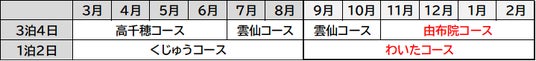 ※「わいたコース」2日目は、春夏の1泊2日「くじゅうコース」と同じ行程となります。